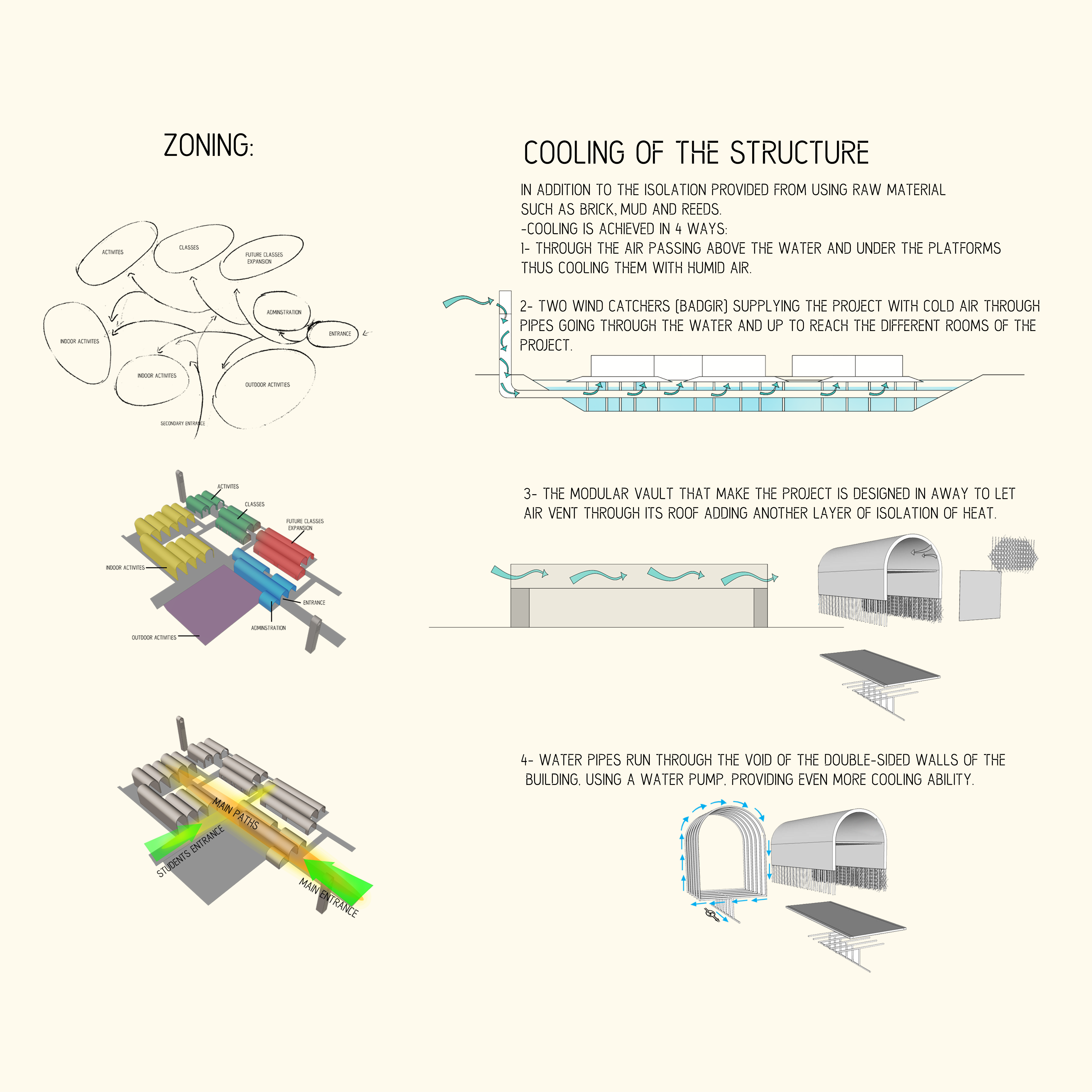 The program is defined by a series of thresholds where people meet for different collaborative work and events such as research, lecture, and recreate. These thresholds also offer spaces of sensory experiences that represents the four different ecologies of UAE, the desert, the mountains, the wetlands, and the coast.